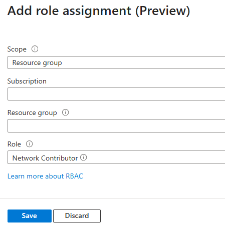 Select Add role assignment to open the Add role assignment pane and enter: