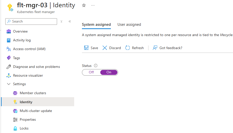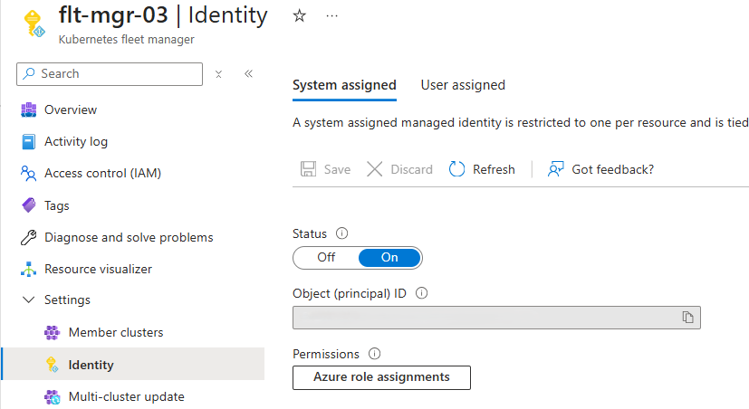 You can verify that the system-assigned managed identity is enabled by checking the Identity blade in the Fleet Manager's Settings section. The Status is On and the Object (principal) ID is populated (not shown in image).