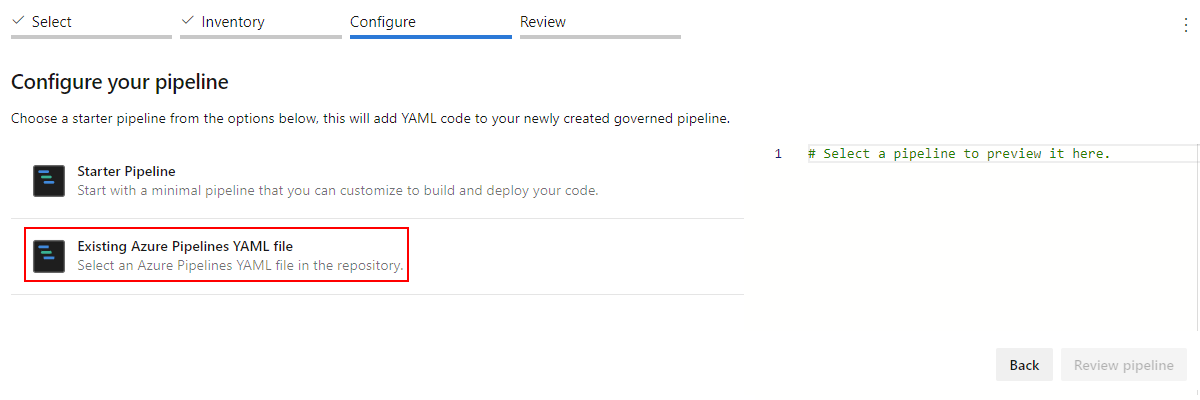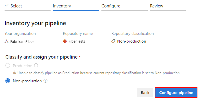 On the Inventory your pipeline pane, confirm the repository information, and select Configure pipeline.