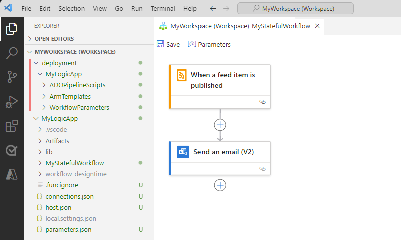 - {logic-app-name}.template.json: A Resource Manager template file that represents the Standard logic app resource named {logic-app-name} and contains the information used to deploy the logic app resource to Azure.WorkflowParameters parameters.json: This JSON file is a copy of the local parameters file and contains a copy of all the user-defined parameters plus the cloud version of any parameters created by the extension to parameterize Azure-hosted connections. This file is used to build the package that deploys to Azure.