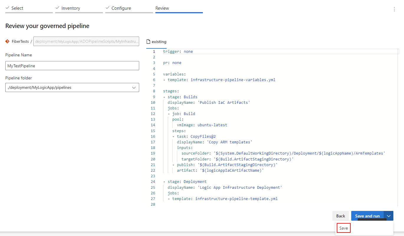 - Pipeline folder: Select the folder for where to save your pipeline, which is named ./deployment/{logic-app-name}/pipelines.