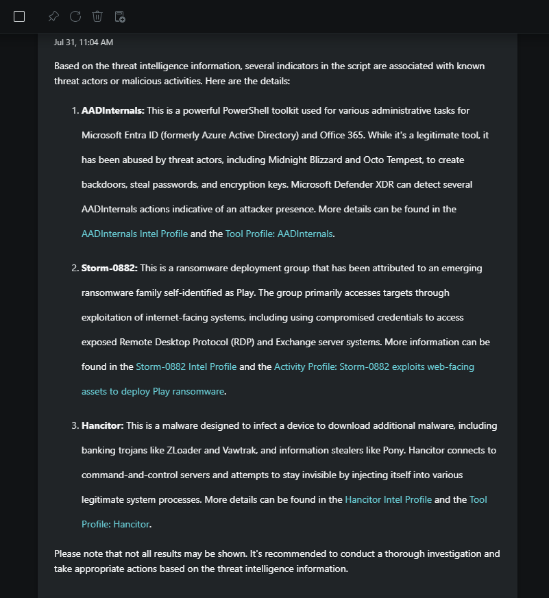 The response indicates that the several indicators in the script are associated with known threat actors. You can pin this response as a critical piece of information that can be used later.