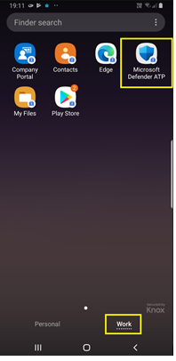 On the device, you can validate the onboarding status by going to the work profile. Confirm that Defender for Endpoint is available, and that you're enrolled using the Personally owned devices with work profile. If you're enrolled using a Corporate-owned, fully managed user device, you have a single profile on the device where you can confirm that Defender for Endpoint is available.