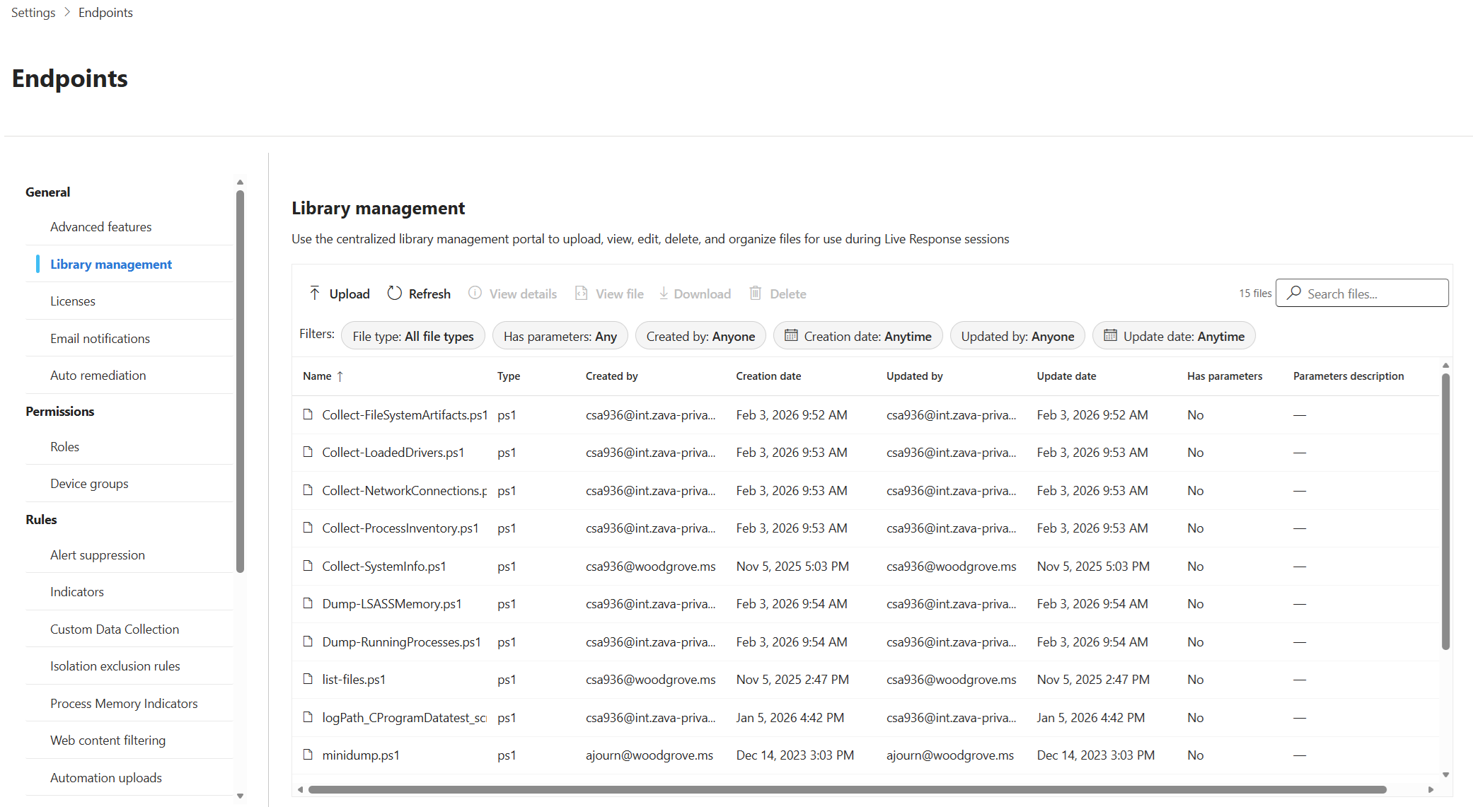 The Library management page in the Microsoft Defender portal allows you to manage files used during Microsoft Defender for Endpoint live response sessions. You can also add, view, and delete files in the library, instead of uploading them during a live response session.