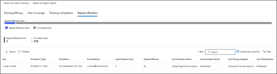 The Repeat offenders card on the Overview and Reports tabs shows the information about repeat offenders. A repeat offender is a user who was compromised by consecutive simulations. The default number of consecutive simulations is two, but you can change the value on the Settings tab of Attack simulation training at https://security.microsoft.com/attacksimulator?viewid=setting. For more information, see Configure the repeat offender threshold.