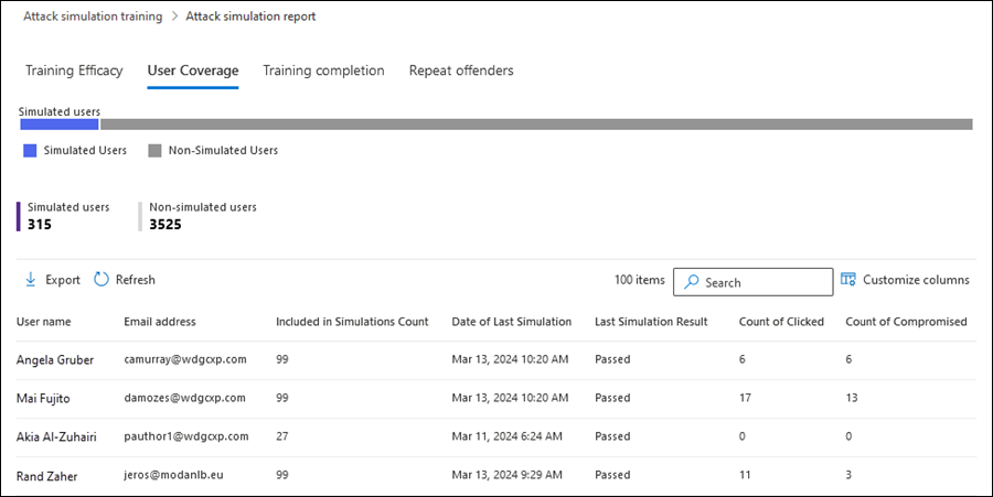Selecting View simulation coverage report takes you to the User coverage tab for the Attack simulation report.