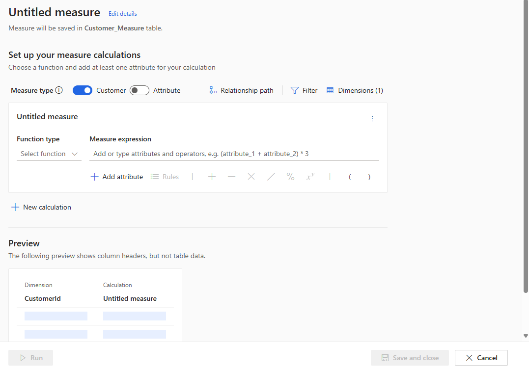 Customer measure: Generates output as its own table named after the name of the measure you define. You can't change it to a customer attribute once run or saved. Customer measures don't show in the customer profile card. Customer measures have a direct relationship to the unified customer profile.