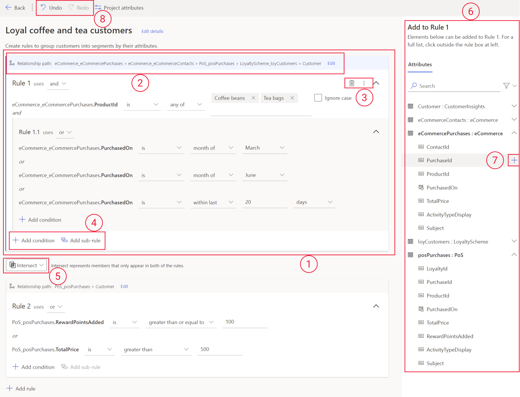 The following image illustrates the various aspects of the segment builder. It shows a segment that results in a group of customers. The customers ordered goods in a specific time frame and gathered reward points or spent a certain amount of money.