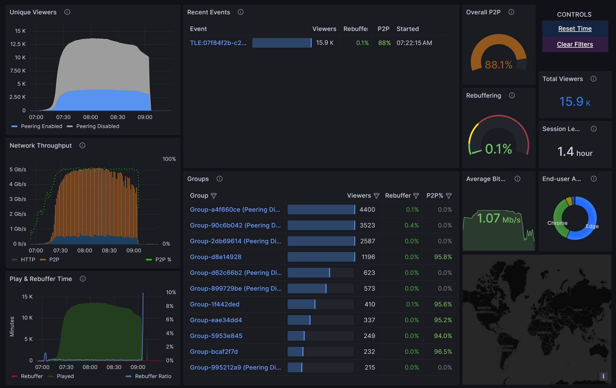 Microsoft eCDN provides granular analytics, which empower admins to carry out performance analysis and network troubleshooting of live events. The analytics tools consist of two dashboards - one that provides a high-level overview of the service operation, and one for a detailed drill-down into the data.