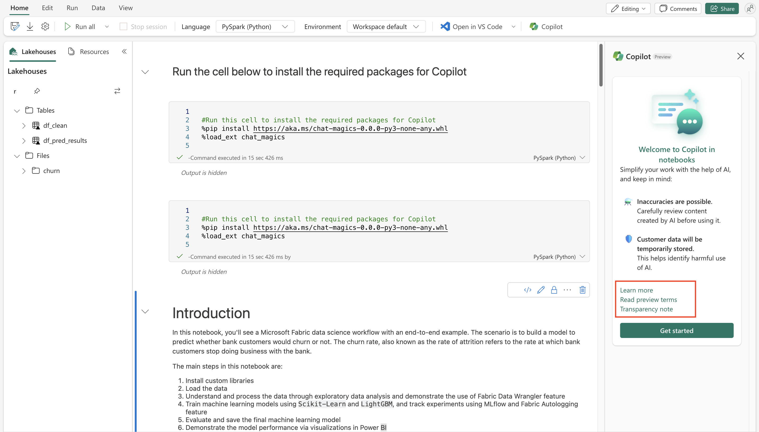 - Explanations: Copilot can provide natural language explanations of notebook cells, and can provide an overview for notebook activity as it runs.