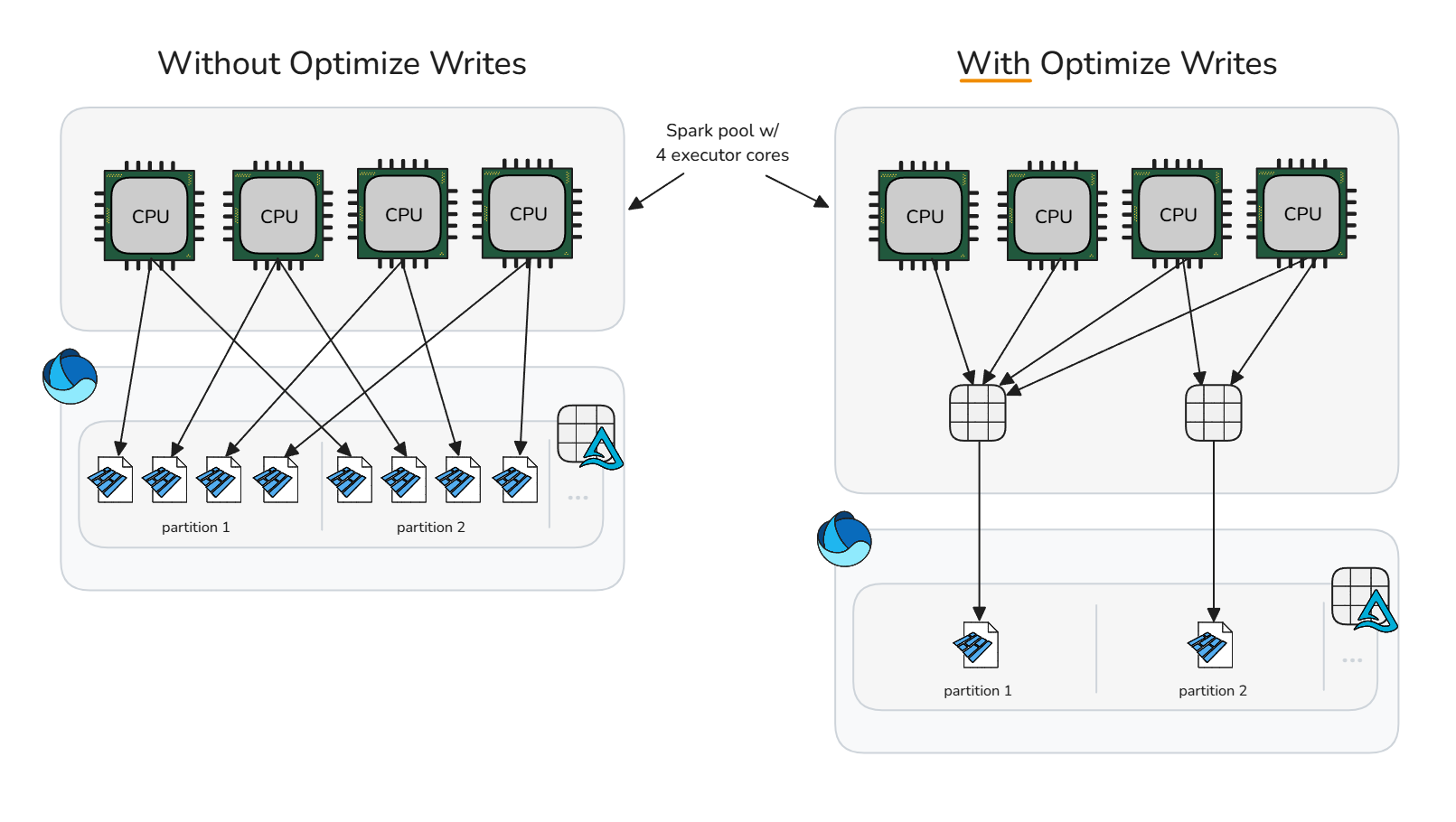 MERGEandUPDATEoperations only rewrite affected files. Right-sized files minimize the number of files touched per operation, reducing the amount of data rewritten. With Deletion Vectors enabled, proper file sizing becomes critical: row-level tombstones in oversized files result in significant cleanup costs during compaction or purge operations.Optimized parallelism: Right-sized files enable Spark to achieve ideal task parallelism. Too many small files overwhelm the scheduler; too few large files underutilize your Spark pool. Optimal sizing maximizes both read and write throughput.