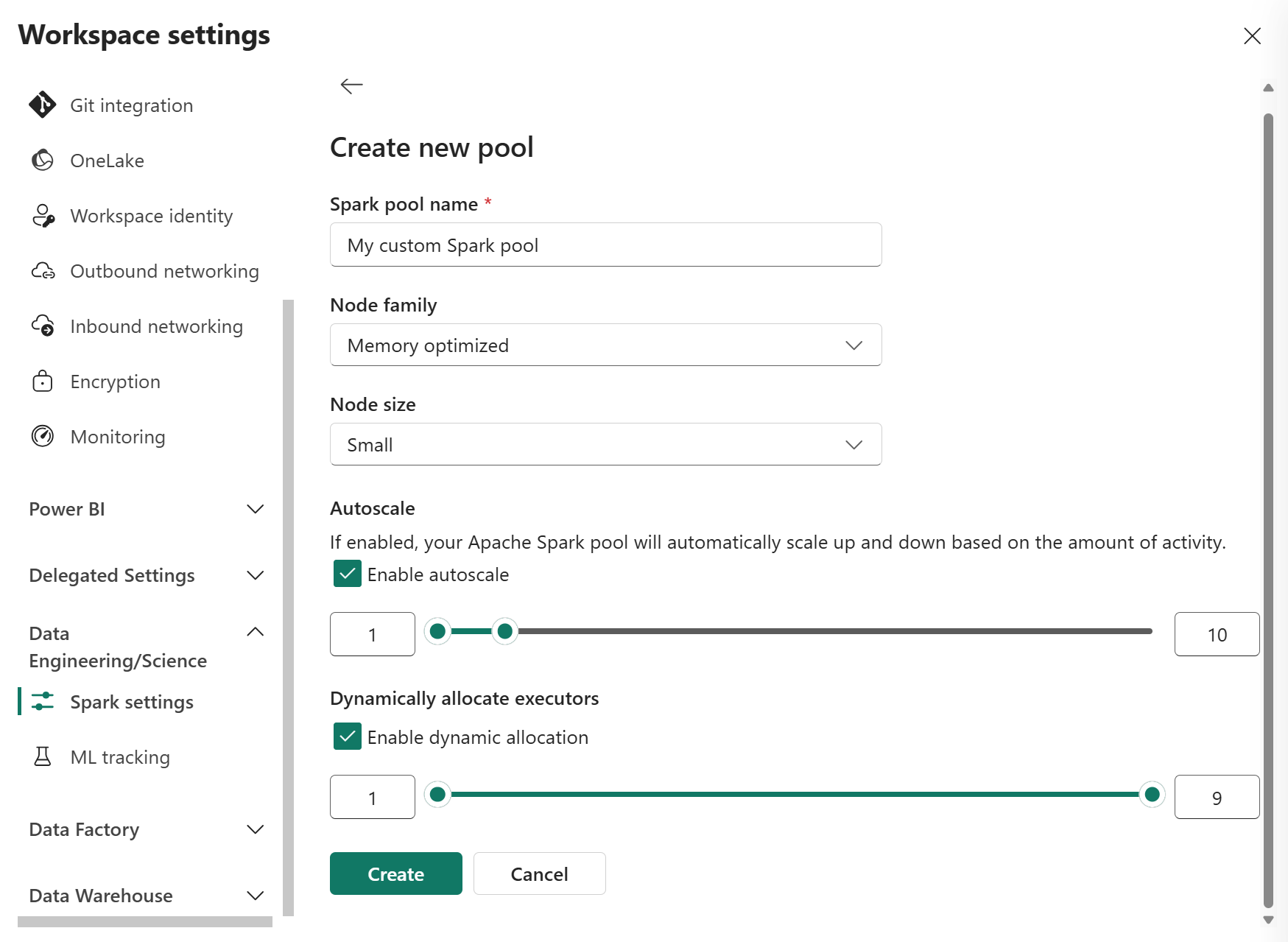 Custom Spark Pool: You can size the nodes, autoscale, and dynamically allocate executors based on your Spark job requirements. To create a custom Spark pool, the capacity admin should enable the Customized workspace pools option in the Spark Compute section of Capacity Admin settings.