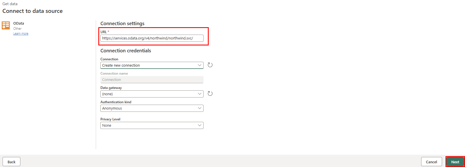 https://services.odata.org/v4/northwind/northwind.svc/for the Open Data feed of theNorthwindsample database. Select the Next button to continue.Scroll down to the Suppliers table from the OData feed and select the checkbox next to it. Then select the Create button.