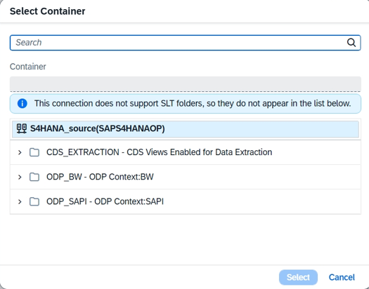 Select the appropriate source container, which is the type of source objects you want to replicate from. The following example uses CDS_EXTRACTION to replicate data from CDS views in an SAP S/4HANA on-premises source system. Then select Select.