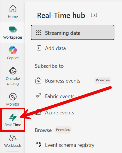 If you see Power BI at the bottom-left of the page, switch to the Fabric workload by selecting Power BI and then by selecting Fabric.