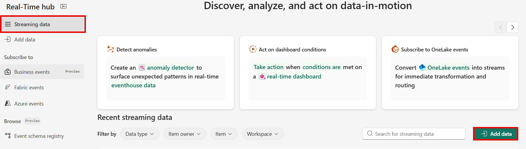The Streaming data page opens by default. Click on the Add data button to get to the Data sources page.