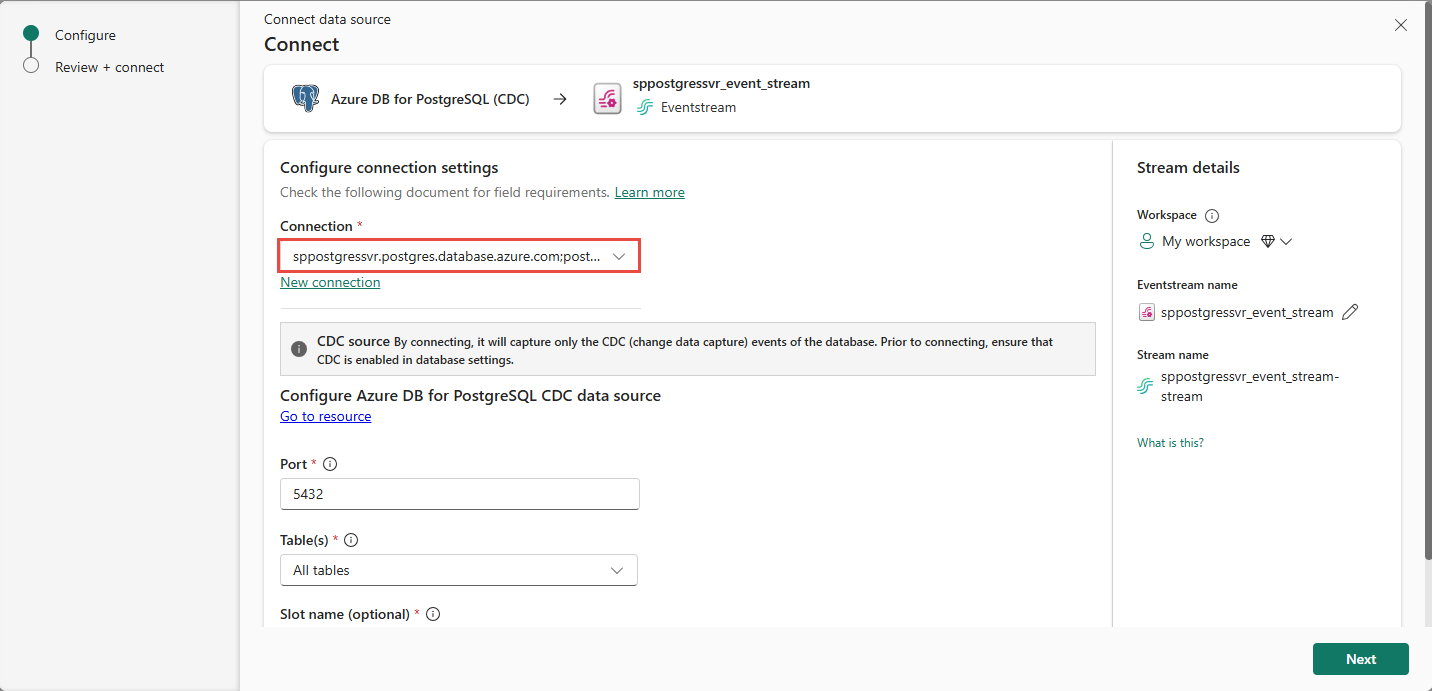 If you have an existing connection to your Azure Database for PostgreSQL CDC source, you can select it from the Connection drop-down list, and move on to configuring port and tables.