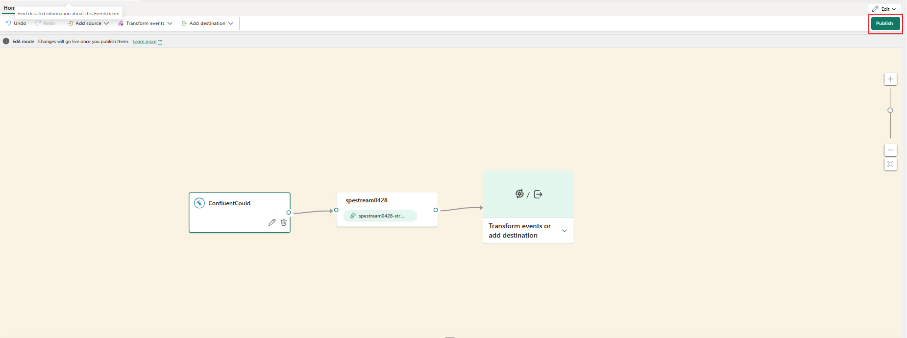 You see that the Confluent Cloud for Apache Kafka source is added to your eventstream on the canvas in Edit mode. To implement this newly added Confluent Cloud for Apache Kafka source, select Publish on the ribbon.