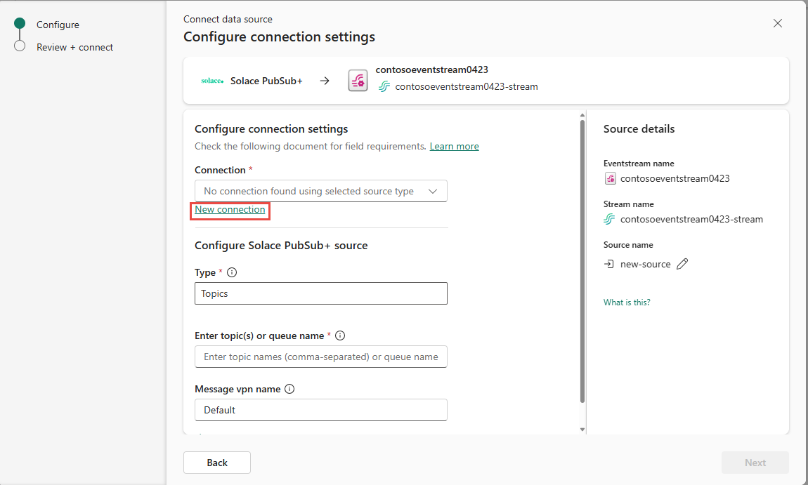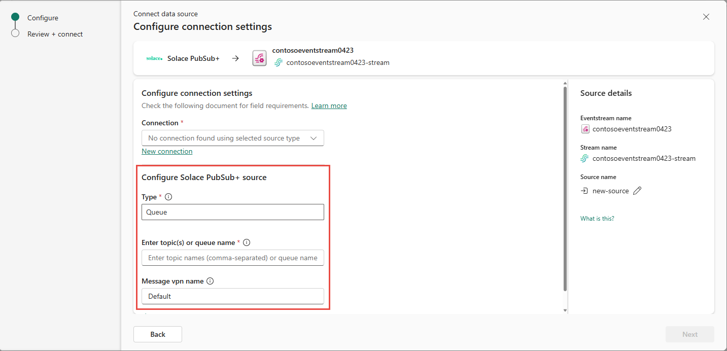 For Connection name, enter a name for the connection to the Solace PubSub+.
