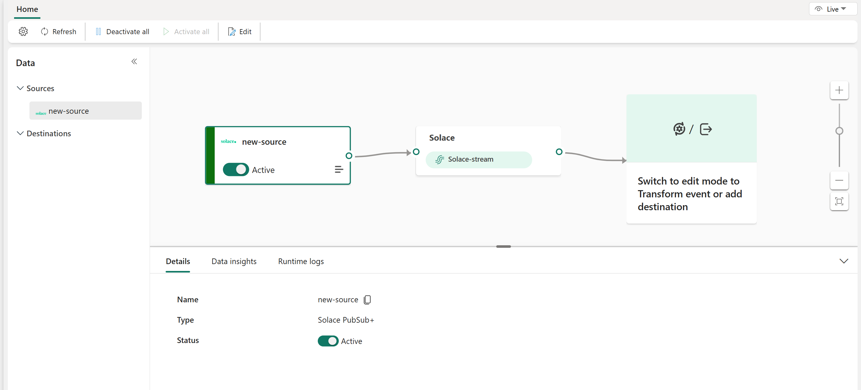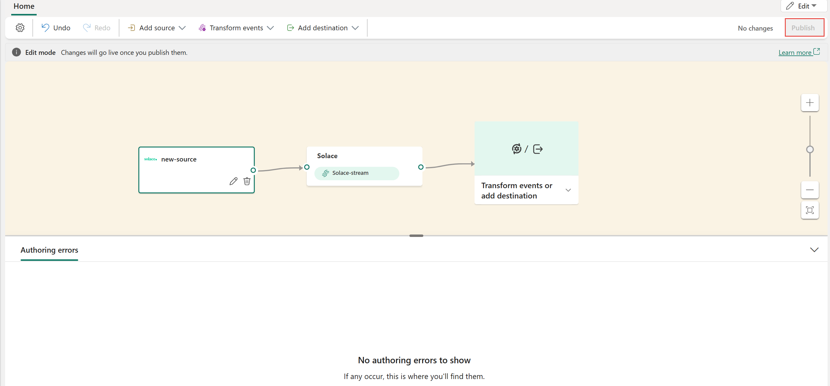 You see that the Solace PubSub+ source is added to your eventstream on the canvas in the Edit mode. To publish it to live, select Publish on the ribbon.