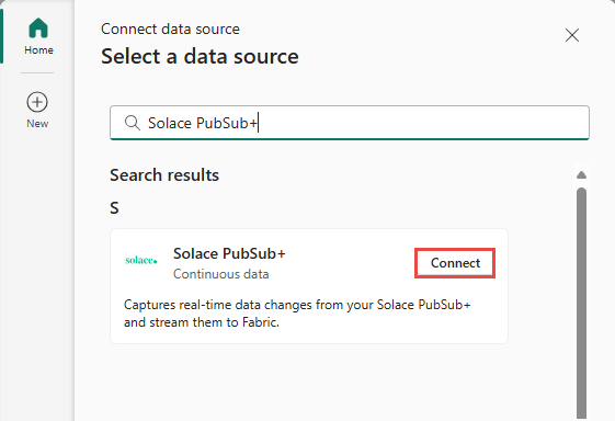 On the Select a data source page, search for and select Connect on the Solace PubSub+ tile.