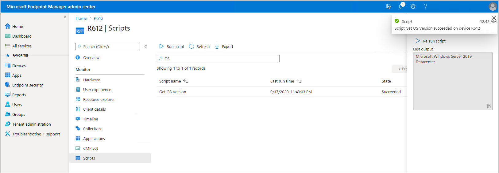 Scripts that were recently run that directly targeted the device will already be listed. The list includes scripts run from the admin center, SDK, or the Configuration Manager console. Scripts initiated from the on-premises console, against collections containing the device won't be shown, unless the scripts were also initiated specifically for the single device.