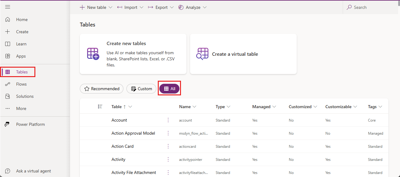 In the side pane, select Tables, and then select All.