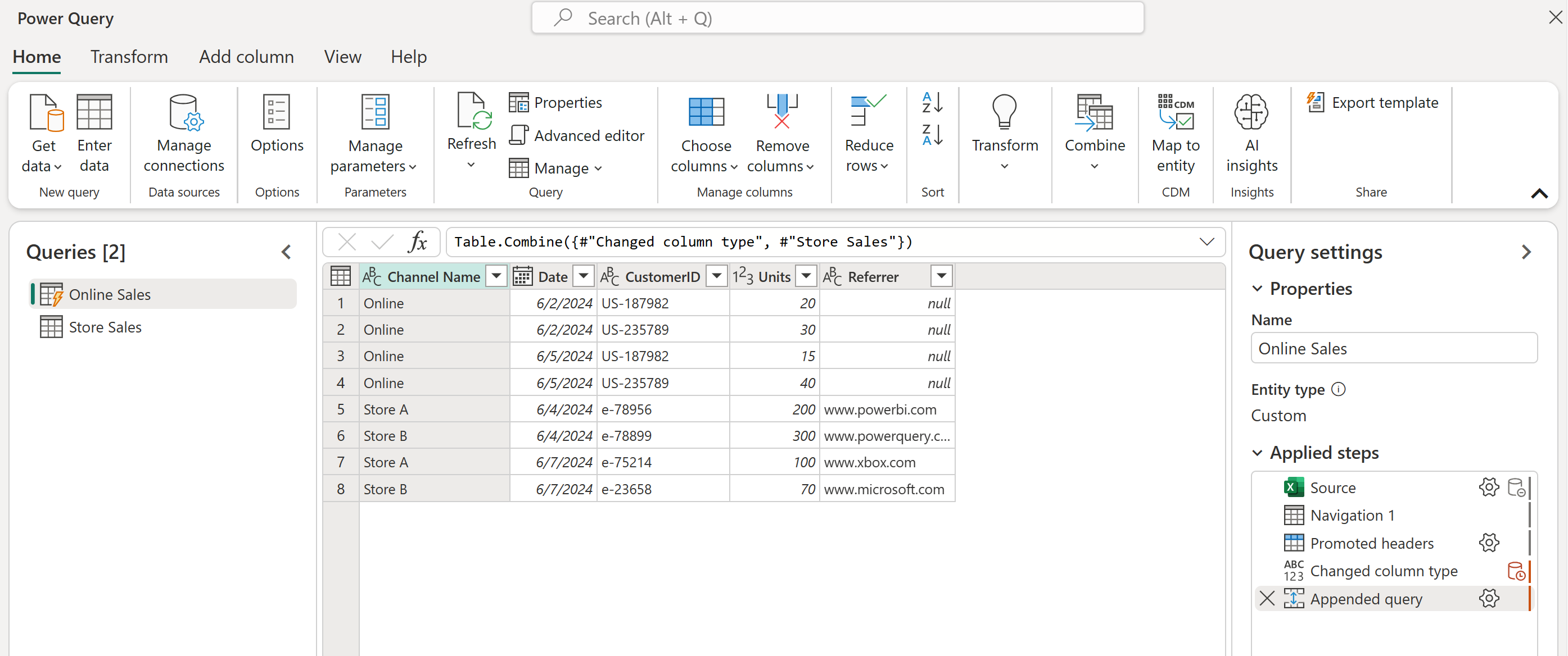 To append these tables, first select the Online Sales table. On the Home tab, select Append queries, which creates a new step in the Online Sales query. The Online Sales table is the primary table. The table to append to the primary table is Store Sales.