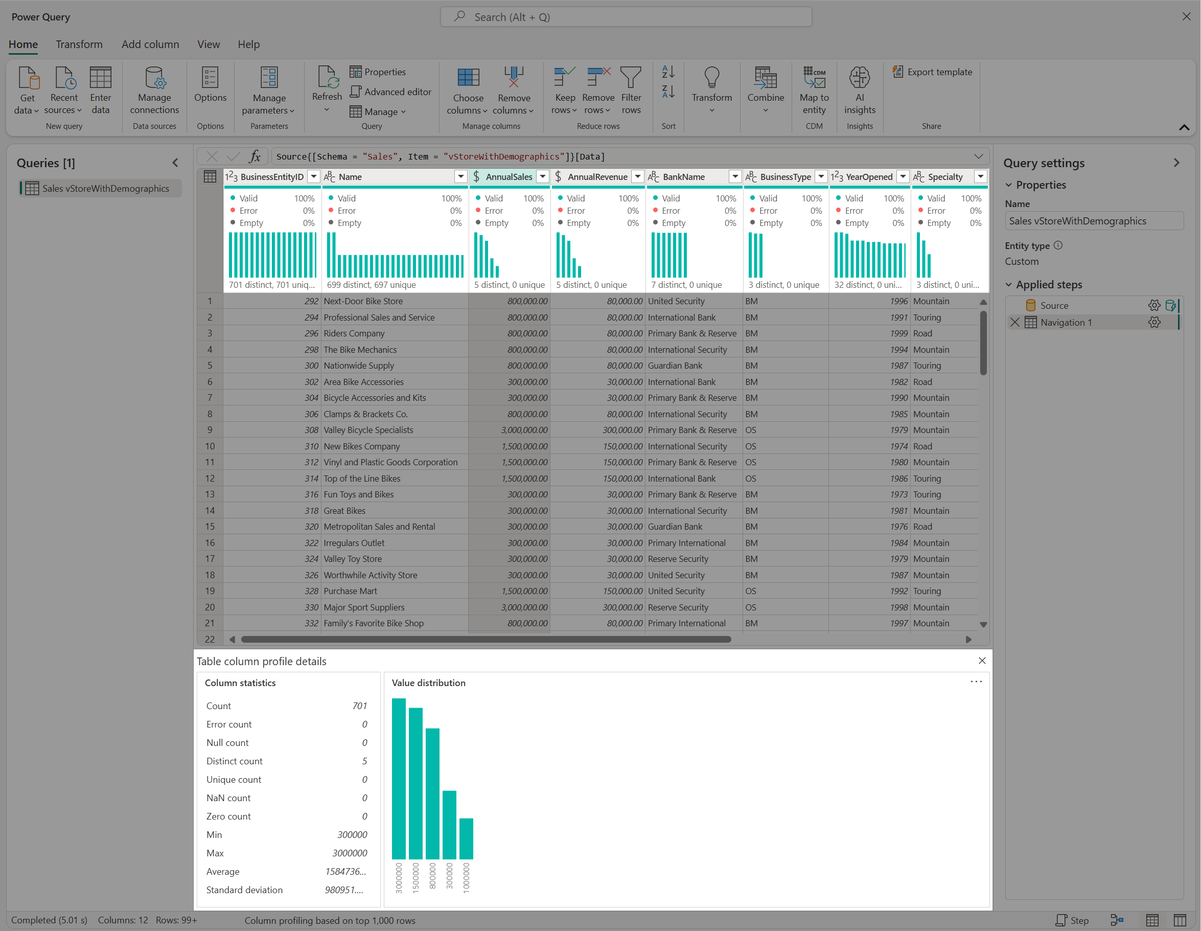 Before you start preparing your data and adding new transformation steps, we recommend that you enable the Power Query data profiling tools to easily discover information about your data.