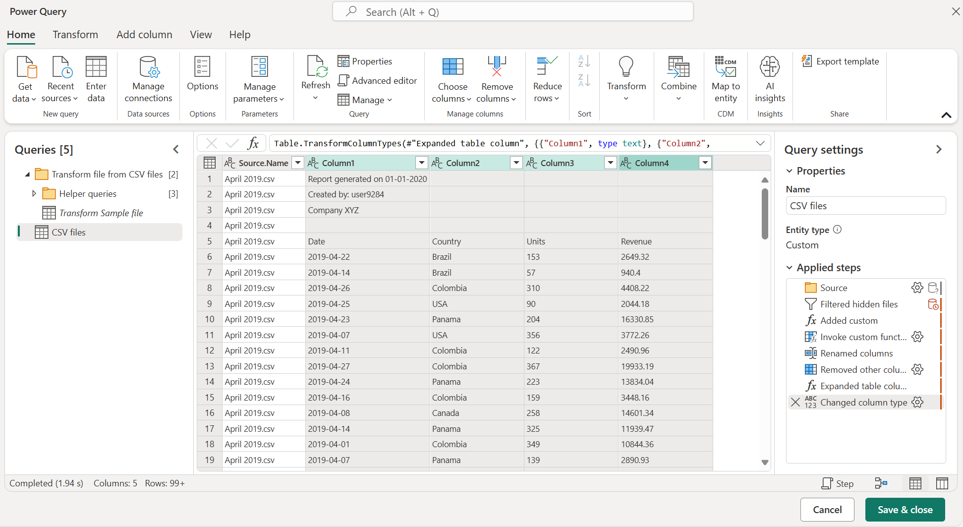 You now need to apply a new set of transformations to clean the data. Each transformation is automatically converted to a function inside the Helper queries group that is applied to every file in the folder before combining the data from each file.