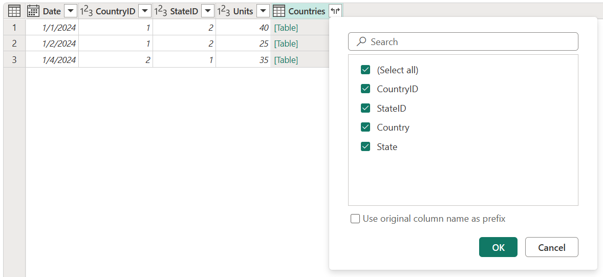 From here, you can choose to expand or aggregate the fields from this new table column, which are the fields from your right table.