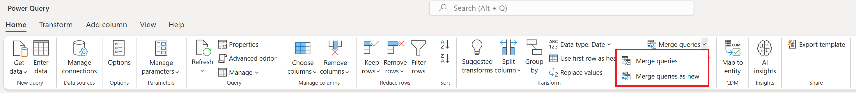 You can find the Merge queries command on the Home tab, in the Combine group. From the drop-down menu, there are two options: