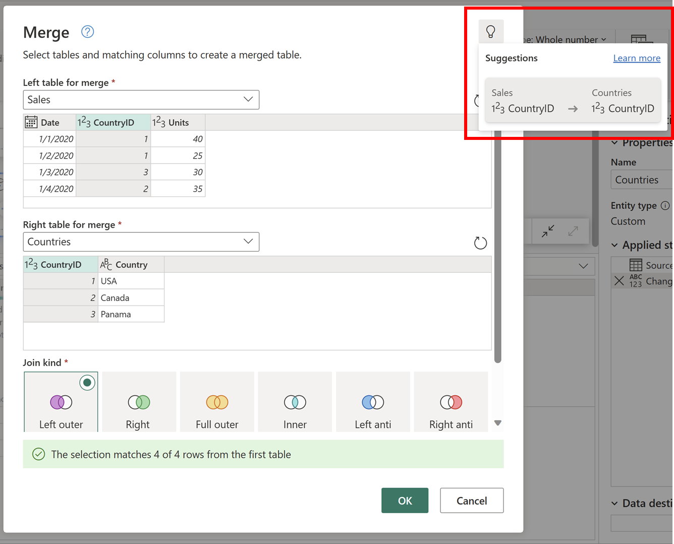 There can be many suggestions in place but, for this scenario, there's only one suggestion by the feature, where it maps the column CountryID from the Sales table to the CountryID column from the Countries table. You can select it and the column-pair-mapping is automatically applied to your dialog.
