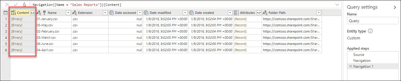 With all the files inside the Sales Reports folder, you could select the Combine files button (see Combine files overview) to combine the data from all the files in this folder to a single table. Or you could navigate directly to a single file of your choice by selecting the Binary value from the Content column.