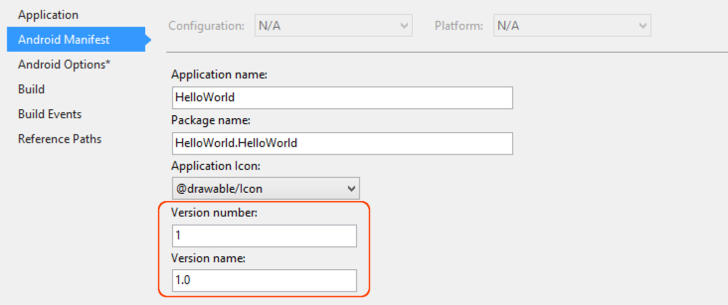 In Visual Studio, these values can be set in the Android Manifest section of project Properties, as shown in the following screenshot: