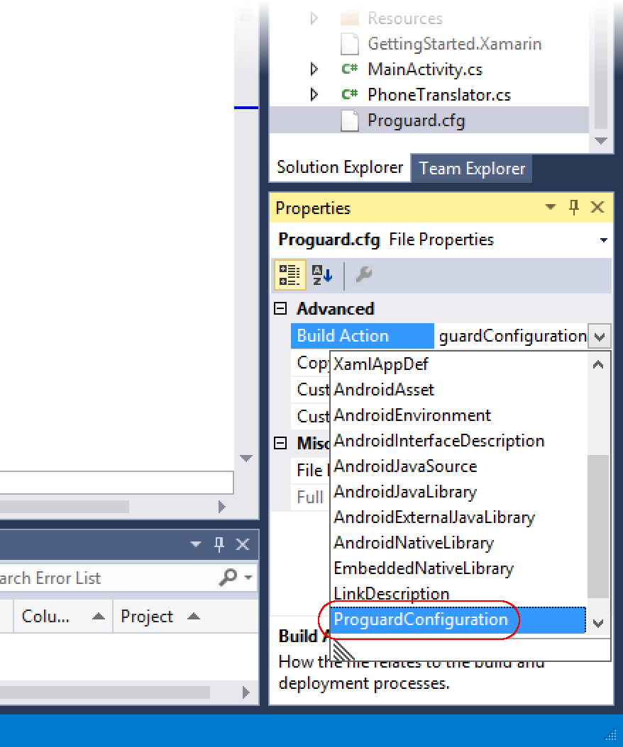 When Enable ProGuard is checked, Xamarin.Android runs the ProGuard tool on the resulting APK. A ProGuard configuration file is generated and used by ProGuard at build time. Xamarin.Android also supports custom ProguardConfiguration build actions. You can add a custom ProGuard configuration file to your project, right-click it, and select it as a build action as shown in this example:
