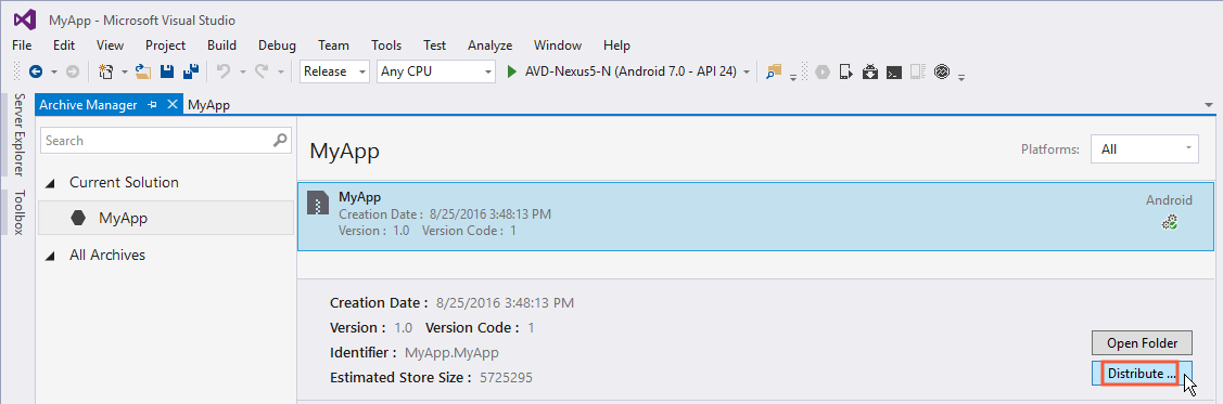 Another way to create an archive is to right-click the Solution in the Solution Explorer and select Archive All..., which builds the solution and archives all Xamarin projects that can generate an archive: