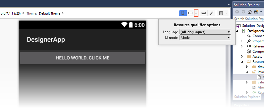 Resource qualifier options can be accessed by clicking the ellipsis icon to the right of the Landscape mode button: