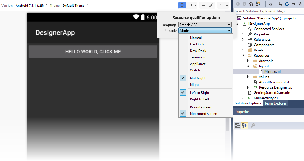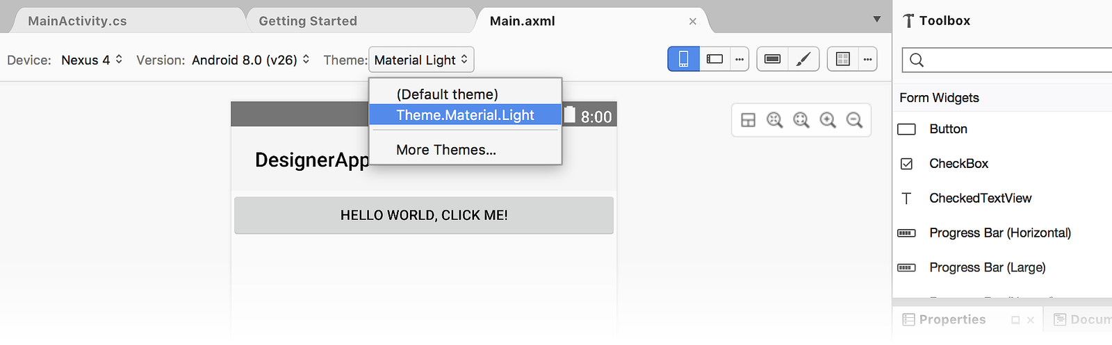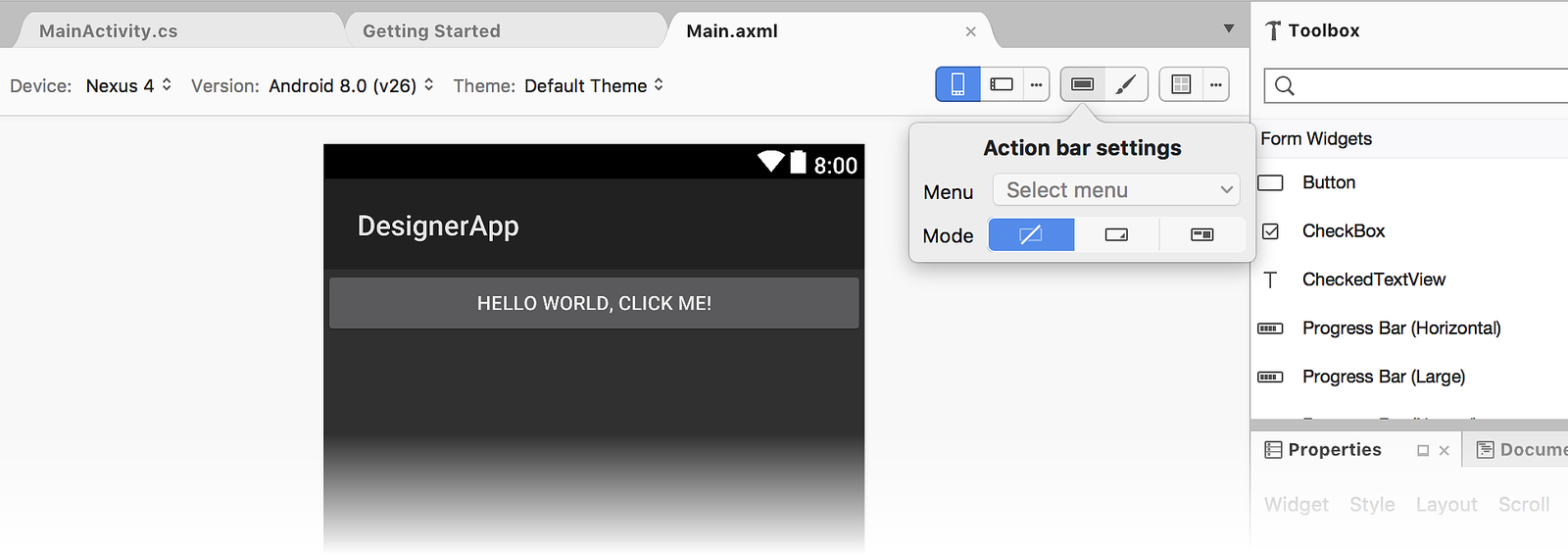 The Android Version selector sets the Android version that is used to render the layout in the Designer. The selector displays all versions that are compatible with the target framework version of the project: