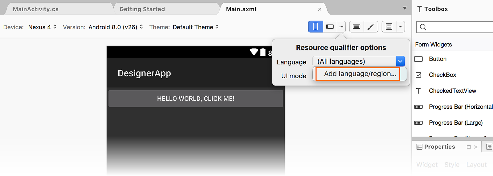 Note that if you add a new language but you do not create new resources for it, the added language will no longer be shown the next time you open the project.