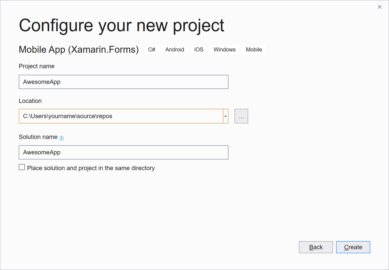 Search for "Xamarin" or choose Mobile from the Project type menu. Select the Mobile App (Xamarin.Forms) project type.