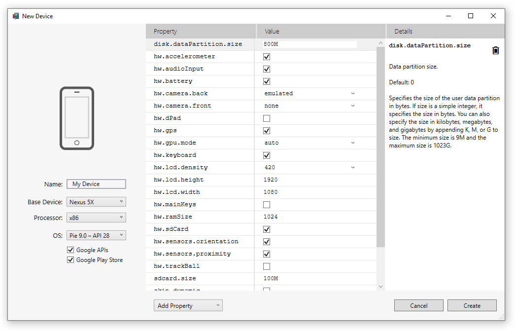 Creating an emulator will return you to the Device Manager window. Click the Start button to launch the new emulator: