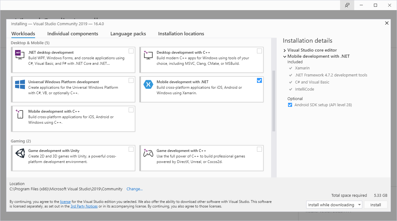 Xamarin can be installed as part of a new Visual Studio 2019 installation, with the following steps:
