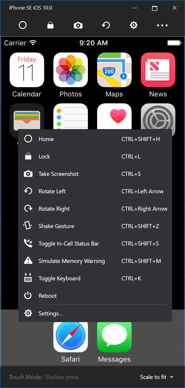The toolbar's ellipsis button reveals other options such as rotation, shake gestures, and rebooting. These same options can be viewed as a list by right-clicking anywhere in the simulator's window: