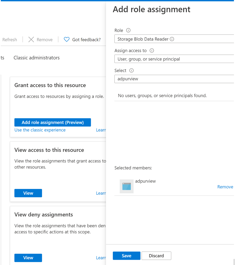 To configure Azure role-based access control (RBAC) permissions, follow this guide. The following screenshot shows how to access the Access Control section in the Azure portal for the data resource to add a role assignment.