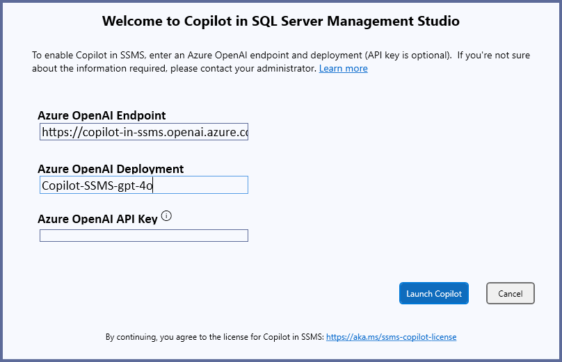 Within the Welcome to Copilot in SQL Server Management Studio dialog, enter the values for Azure OpenAI Endpoint, Azure OpenAI Deployment, and Azure OpenAI API Key that were configured during setup of the Azure OpenAI resources. It might be necessary to obtain these values from an individual who can configure Azure OpenAI resources within your Azure subscription.