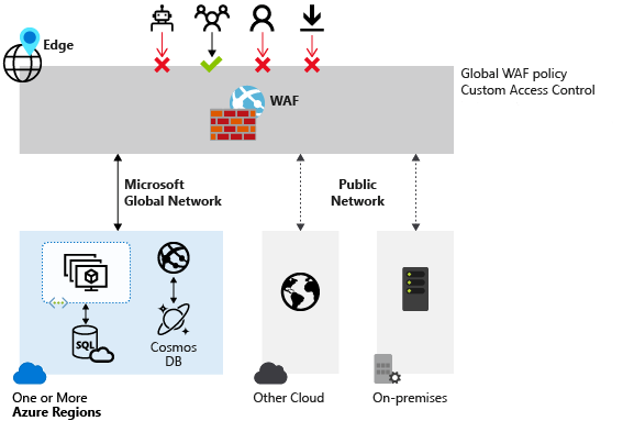 - Azure Front Door: Microsoft's global content delivery network (CDN) and application delivery platform. WAF on Azure Front Door provides global protection, blocking attacks closer to the source before traffic reaches your infrastructure. This is useful for globally distributed applications that need consistent protection across all regions.