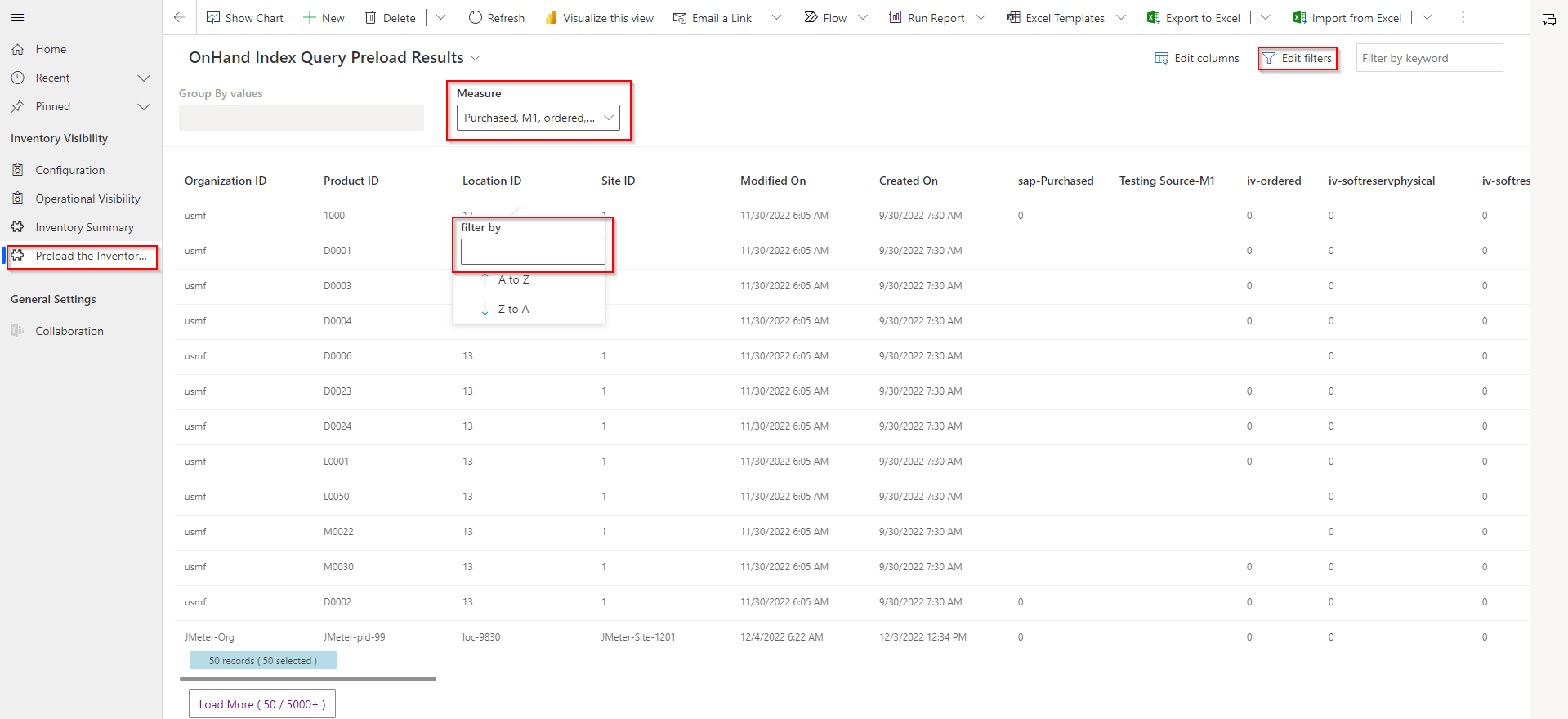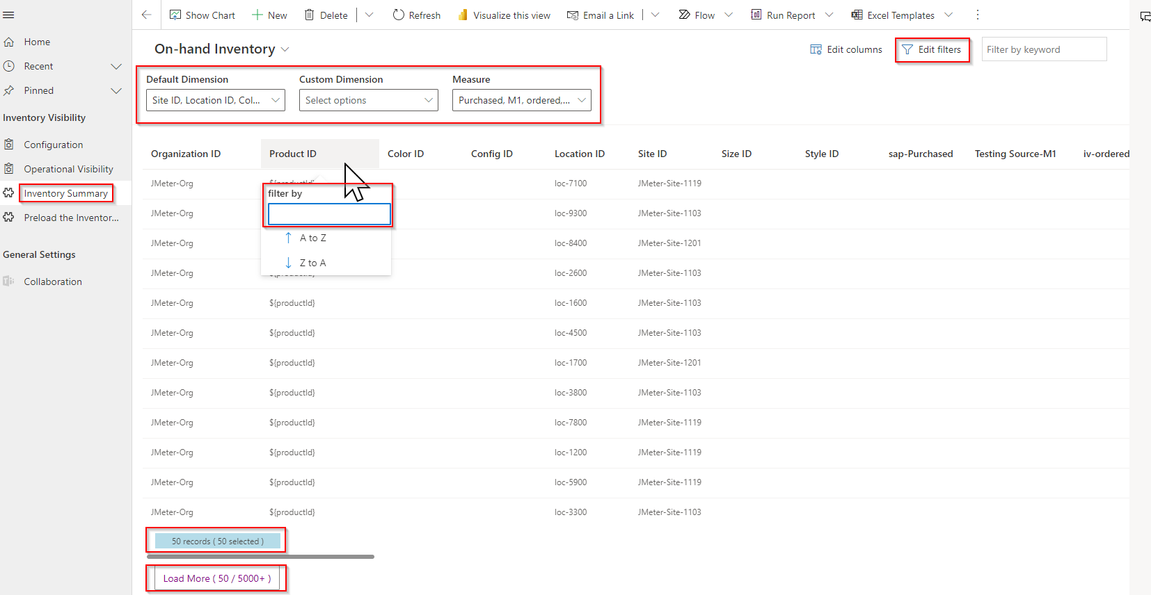 The Inventory Summary page provides three fields above the grid: Default Dimension, Custom Dimension, and Measure. You can use these fields to control which columns are visible in the grid. You can directly filter on columns by selecting the column header of the column that you want to filter on. If the following screenshot appears, notice that it highlights the dimension filtering, result count, and Load More options on the Inventory Summary page.