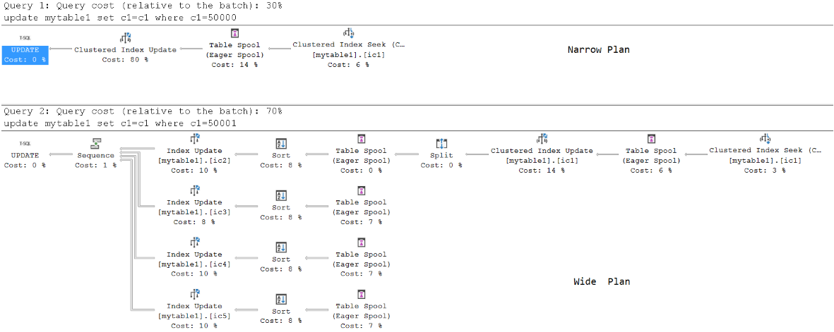 UPDATEstatement was executed.The following screenshot shows wide and narrow plans when data is cached in the buffer pool: