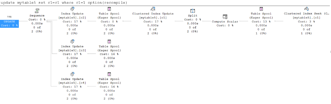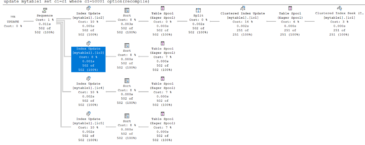 UPDATEstatements, and compare the query plans:UPDATE mytable1 SET c1=c1 WHERE c1=1 OPTION(RECOMPILE)- one row is updatedUPDATE mytable1 SET c1=c1 WHERE c1=50000 OPTION(RECOMPILE)- 250 rows are updated.UPDATE mytable1 SET c1=c1 WHERE c1=50001 OPTION(RECOMPILE)- 251 rows are updated.